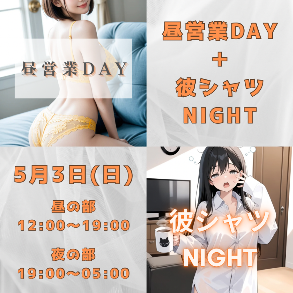 5月3日(日) は、昼営業DAY☀️+彼シャツNIGHT👕💖